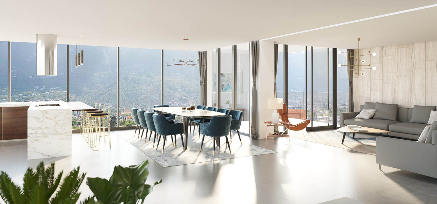 Ofrece 3 exclusivos departamentos de lujo con imponentes vistas de la Sierra Madre, muy cerca del Parque Ecológico Chipinque, se localiza sobre la Avenida Roberto Garza Sada.
